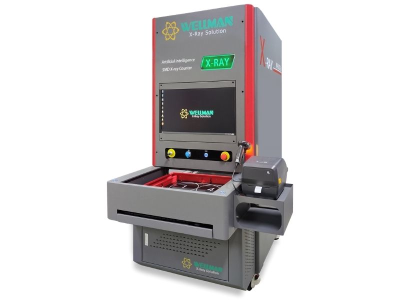The Microfocus X-Ray Parts Counter XC-01 is a microfocus X-ray–based component counting system designed to automate component counting in SMT production and warehouse operations. It enables fast and highly accurate counting of SMD components on reels and trays.